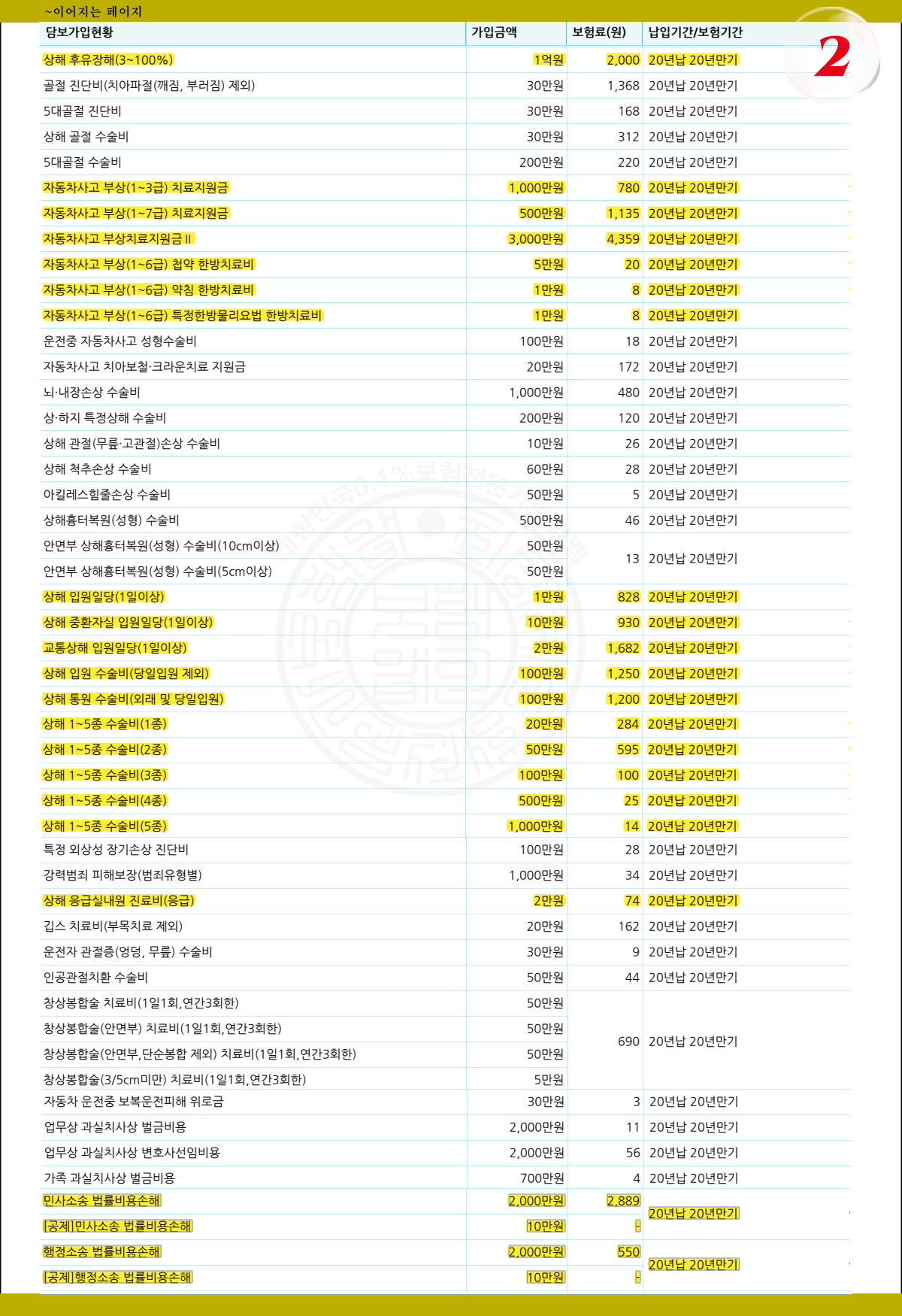 | 일반상해 후유장해 | 10,000 | 2,000 |
