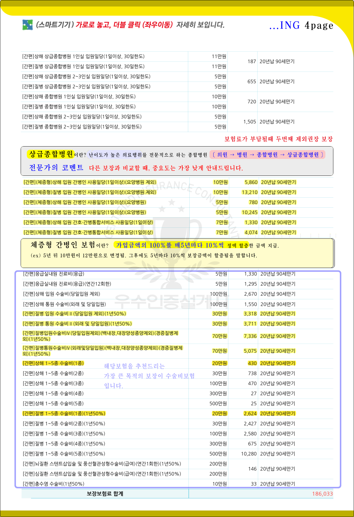 → 탑재 된「 주요보장체크 」상해사망(기본계약) 최소 / + 납입면제 + 납입지원 / 암진단비보험 + 암주요치료비 + 비금여암주요치료비 + 뇌혈관진단비 + 허혈성진단비 + 기타심혈관진단비 + 양성신생물수술비 + 혈전용해치료비 + 간병인보험 + 상급병실입원 + 질병수술비 + 상해수술비 + 질병종수술비 + 상해종수술비 + 외