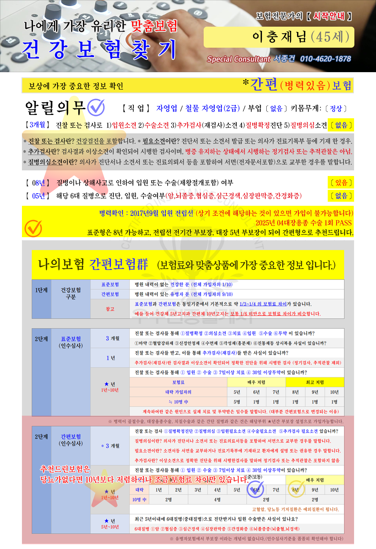 이충재님의 병력에 따라 추천보험이 완전히 달라집니다.