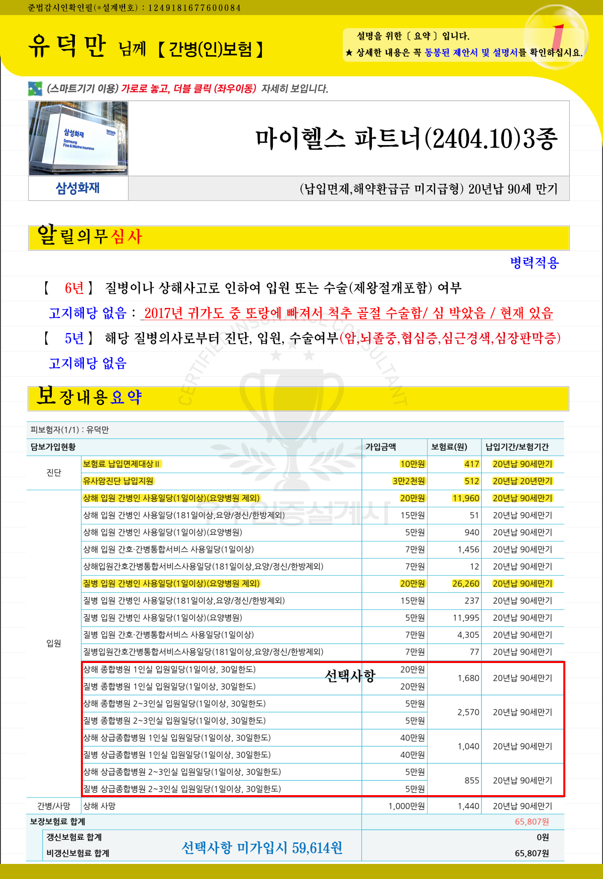 유문영님과 동일설계에서 ▶ 123인실일당은 제한 ▶ 보험료할증 ▶ 실손과 종합보험 모두 할증 + 유방전기간 부담보