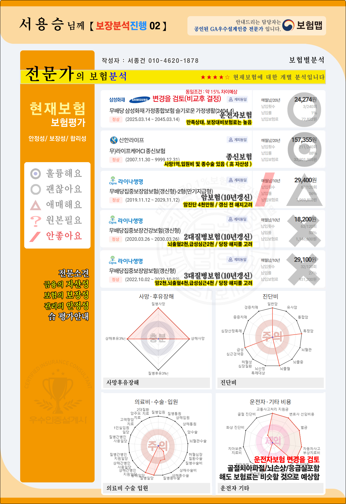 전체를 분석하여 ( ① 적합성, ②보장성, ③합리성, ④ 자산성 ) 추천보험을 전문 진행 드립니다.