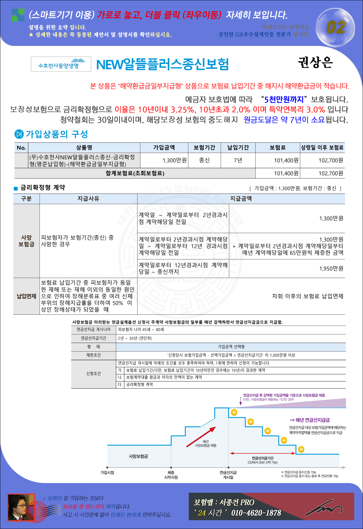 ① 해당보험은 금리확정형보험으로 사망시 1300만원 + α 가 지급되는 종신보험입니다.